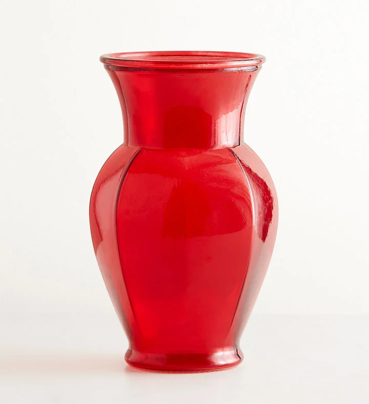 Artistically designed in our exclusive ruby red glass vase; measures 8.75”H
