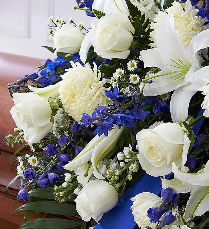 Honor a life so beautifully lived with a proud display of blue and white blooms. Our half casket cover, crafted with care and artistry by our expert florists with blue delphinium, white roses, and accented with a blue satin ribbon, is an unforgettable way to commemorate a lifetime of loving devotion.