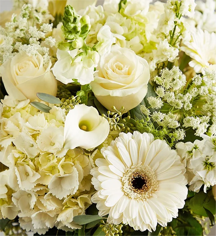 EXCLUSIVE Celebrate the life of a loved one with our beautiful floral tribute. A gathering of all-white blooms, featuring unique varieties like hydrangeas and mini calla lilies, is accented by lush greenery for an elegant presentation. Designed in a clear glass vase, it’s a special way to honor their memory, while comforting family and friends.