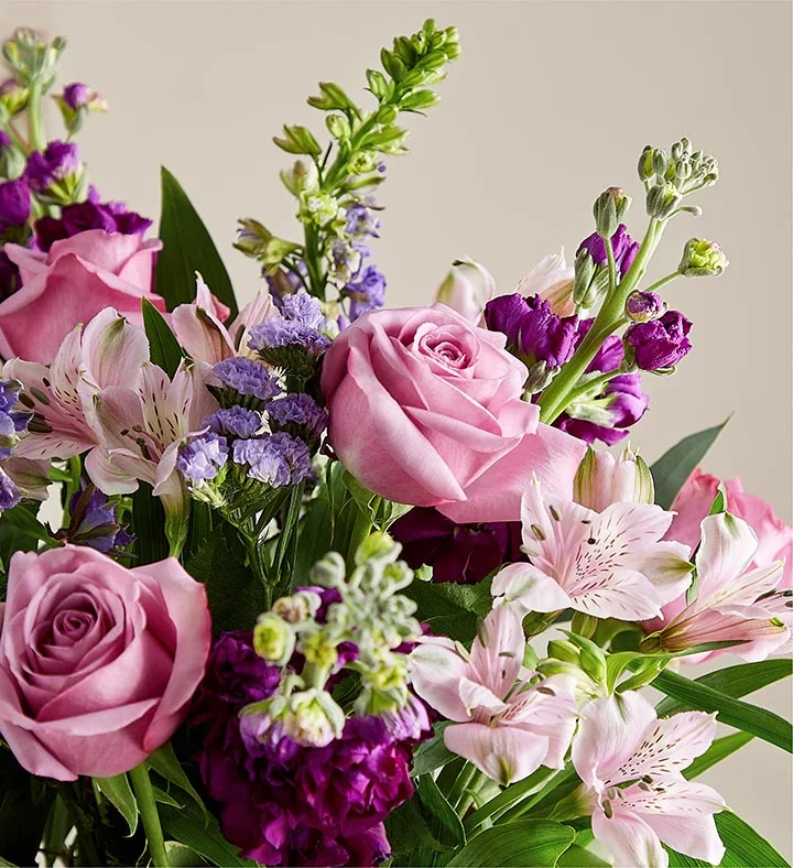 • All-around arrangement with lavender roses, Peruvian lilies (alstroemeria) and statice, purple larkspur and stock; accented with feather willow eucalyptus and assorted greenery