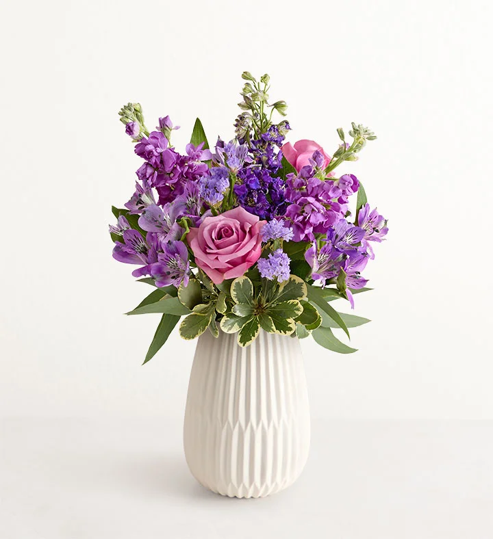 EXCLUSIVE Send a sweet, thoughtful expression with our everyday bouquet. Hand designed by our florists, this garden-inspired gathering features soothing lavender and purple, along with accents of cascading greenery. It’s arranged in our keepsake White Modern Vase, with a tapered design and matte finish that complements the beauty of every bloom.